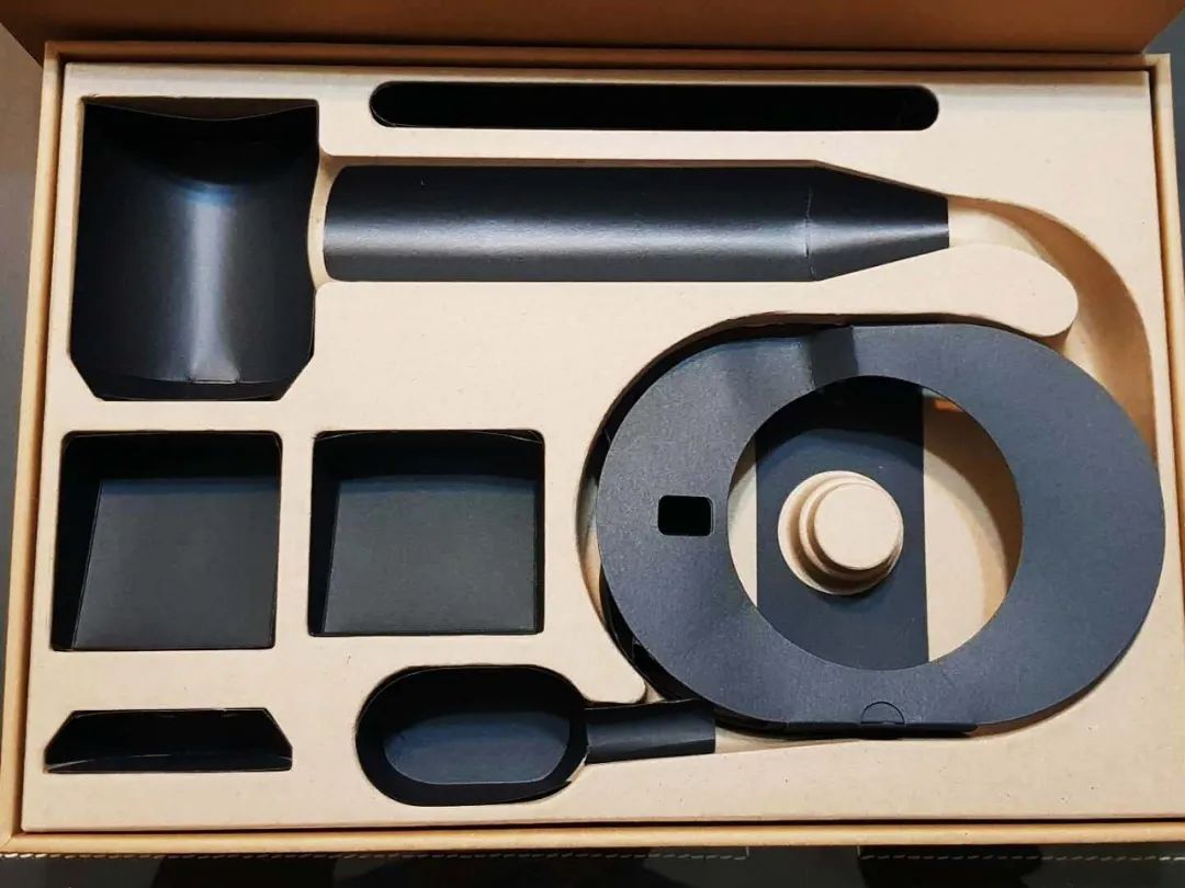戴森是最早使用精品纸浆模塑缓冲的小家电知名企业,里面使用内衬是纸浆模塑,使用牛皮色纸浆,质感细腻柔顺,接触产品烤漆面接触面使用黑色卡纸,除了避免刮伤也增加视觉美感。