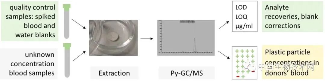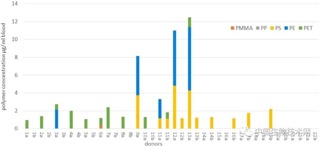 他们在排除血液样本受到污染的可能性后,在17人(77%)的血液中检测到了可量化的微塑料,平均每毫升血液中有1.6微克。其中最常见的塑料为聚对苯二甲酸乙二醇酯(PET)、聚苯乙烯(PS)、聚乙烯(PE)、聚丙烯(PP)和聚甲基丙烯酸甲酯(PMMA)。其中,PET、PS和PE分别占到50%、36%和23%。
